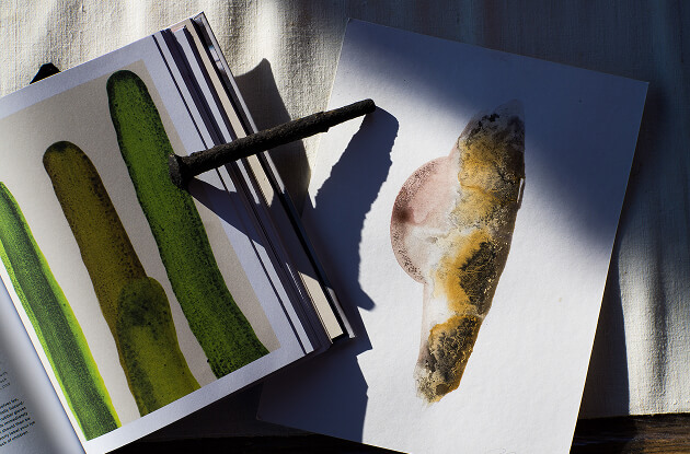 Partendo dalle nozioni apprese in merito alla tintura dei tessuti e rimanendo ogni volta affascinata e stupita di fronte alla bellezza, intensità e resistenza dei colori di origine naturale, utilizzai come supporto la carta e incominciai a produrre dei veri e propri inchiostri, più concentrati e densi, sensibili al tempo e all’ambiente, ponendomi ogni volta come uno spettatore che si lascia stupire dall’imprevedibile mutevolezza della materia e che da essa trae insegnamento.