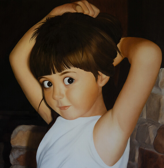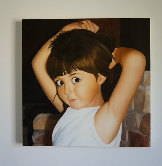 L’immagine che più mi rappresenta è questa, di me bambina con la frangetta e due enormi occhioni furbi in primo piano. Creare un dipinto partendo da una mia vecchia foto è stato un po’ come ritornare indietro nel tempo, e ora, ogni volta che osservo il quadro penso a lei e alla sua spensierata e curiosa anima.