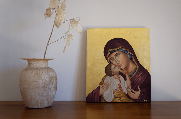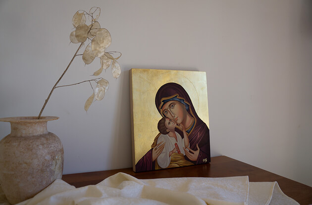 Questa icona rappresenta il primo lavoro di arte sacra da me realizzato. Il viso della Vergine è rilassato e gli occhi sono dolci, i colori caldi e raffinati e le curve delle figure morbide; a dare ancora più importanza e luce all’insieme però è la doratura sullo sfondo, realizzata con sottilissimi fogli di foglia d’oro 22 kt.